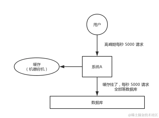 对于系统 A,假设每天高峰期每秒 5000 个请求,本来缓存在高峰期可以扛住每秒 4000 个请求,但是缓存机器意外发生了全盘宕机。缓存挂了,此时 1 秒 5000 个请求全部落数据库,数据库必然扛不住,它会报一下警,然后就挂了。此时,如果没有采用什么特别的方案来处理这个故障,DBA 很着急,重启数据库,但是数据库立马又被新的流量给打死了。