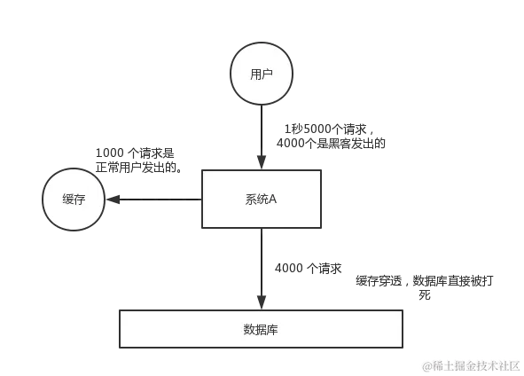 黑客发出的那 4000 个攻击,缓存中查不到,每次你去数据库里查,也查不到。