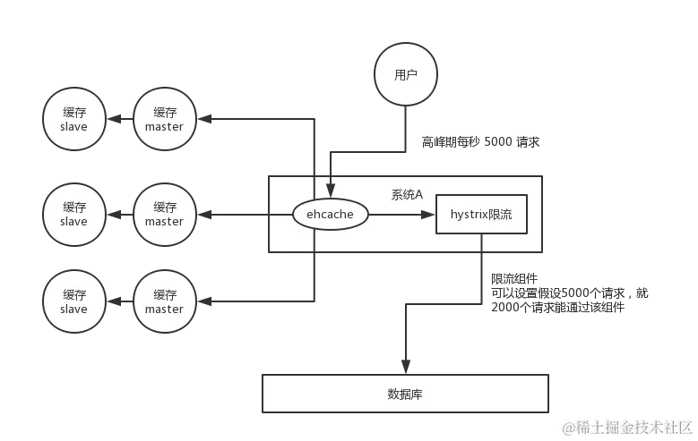 用户发送一个请求,系统 A 收到请求后,先查本地 ehcache 缓存,如果没查到再查 redis。如果 ehcache 和 redis 都没有,再查数据库,将数据库中的结果,写入 ehcache 和 redis 中。