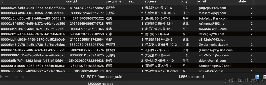 根据控制变量法,我们只把每个表的主键使用不同的策略生成,而其他的字段完全一样,然后测试一下表的插入速度和查询速度: