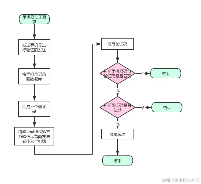 - 首先输入手机号,然后发送到服务端,服务端将手机号记录在我们数据库中,然后生成随机验证码,并将手机号和验证码绑定到一个redis里面,然后记录过期时间,这个过期时间一般是10分钟左右,这就是我们一般手机验证码的有效期。