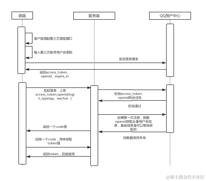 - 客户端拿到access_token、openid、login_type(qq、wechat...)请求应用服务器,应用服务器拿到这些数据后就会根据对应的login_type去对应的用户中心进行access_token和openid进行校验。校验不通过则返回对应错误码