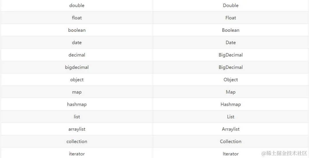 实际开发中,有很多返回类型是数据基本类型或者String,Map,List等非常常见的类型,这些类型MyBatis已经为我们提供好了别名,我们就不需要另外再定义了。以下就时MyBatis中默认提供的别名:PS:这些别名的字母都是不区分大小写的,因为MyBatis在注册别名的时候会全部转为小写字母存储