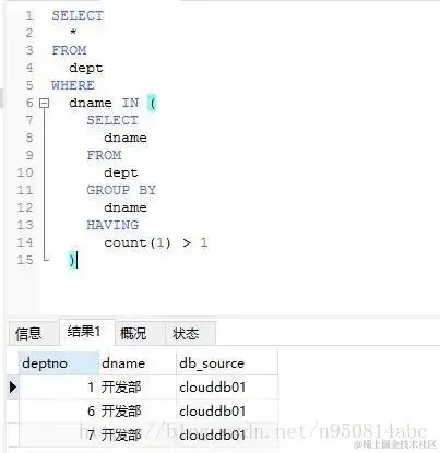 查询出:根据dname分组,同时满足having字句中组条件表达式(重复次数大于1)的那些组
