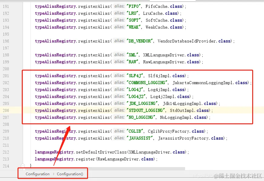 虽然别名都存在TypeAliasRegistry类里面,但是我们前面介绍MyBatis配置文件的时候,列出了TypeAliasRegistry类中默认初始化的别名,并没有看到日志相关类的别名,那么日志的别名又是在哪里配置的呢?我们打开Configuration类: