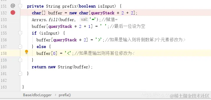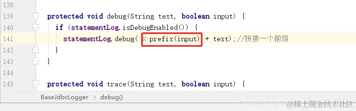 那就需要进入debug方法里面继续看一看,这个debug方法是在抽象类BaseJdbcLogger里面实现的,所以我们还需要看看BaseJdbcLogger类的debug方法。