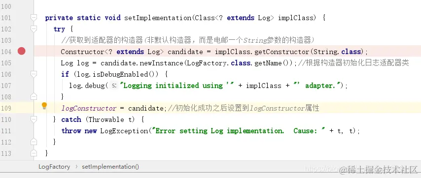 下面这里如果加载成功之后就会对logConstructor进行赋值,那么后续的方法就不会再执行run()方法, 而如果抛出异常,因为已经被捕获了,所以就会继续往后执行静态代码块内的方法。