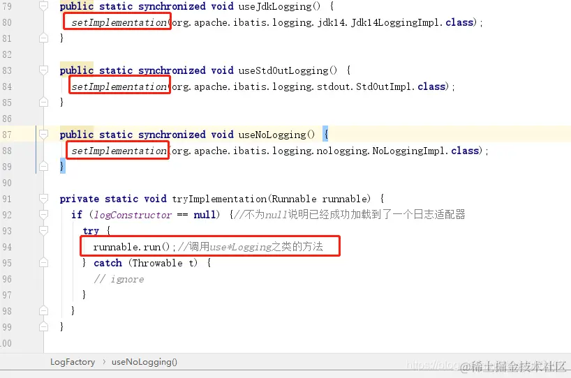 再看一下tryImplementation方法,如果logConstructor不为空,说明当前还没有加载到日志适配器,那就继续执行run()方法,也就是继续执行useXXXLogging方法,而所有的useXXXLogging方法都是调用了setImplementation方法。