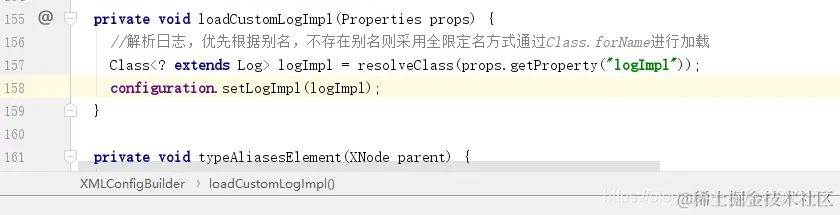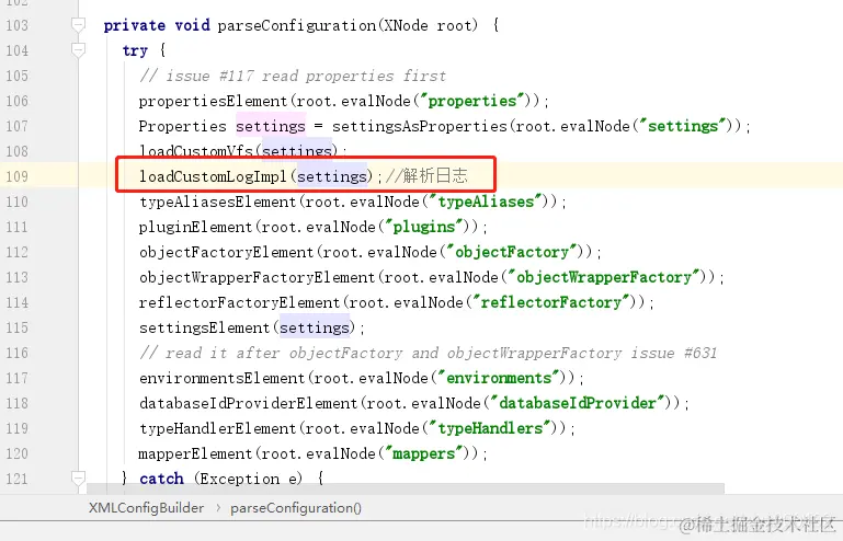 老规矩,我们还是先找到加载mybatis-config配置文件中的解析日志的源码: