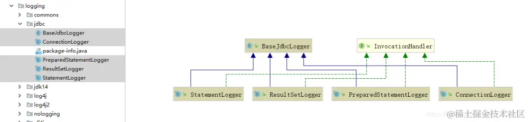 很明显,MyBatis将日志拆分成了ConnectionLogger,PreparedStatementLogger,ResultSetLogger,StatementLogger四种类型分开处理,它们都继承了BaseJdbcLogger类,而且实现了InvocationHandler接口,也很明显,这里用到了JDK动态代理。