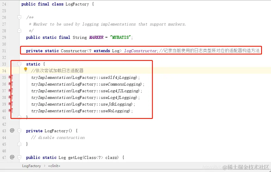 LogFactory工厂是负责创建日志对象对应的适配器。LogFactory的静态代码块内按顺序初始化了所有内置的日志