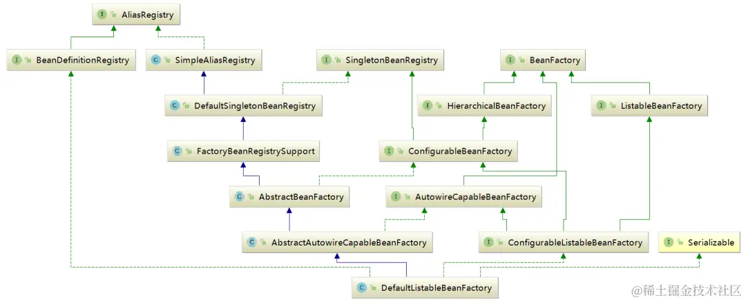 从上面的类图中,我们可以清晰地从全局角度了解DefaultListableBeanFactory的脉络。接下来先了解一下上面类图中各个类的作用。