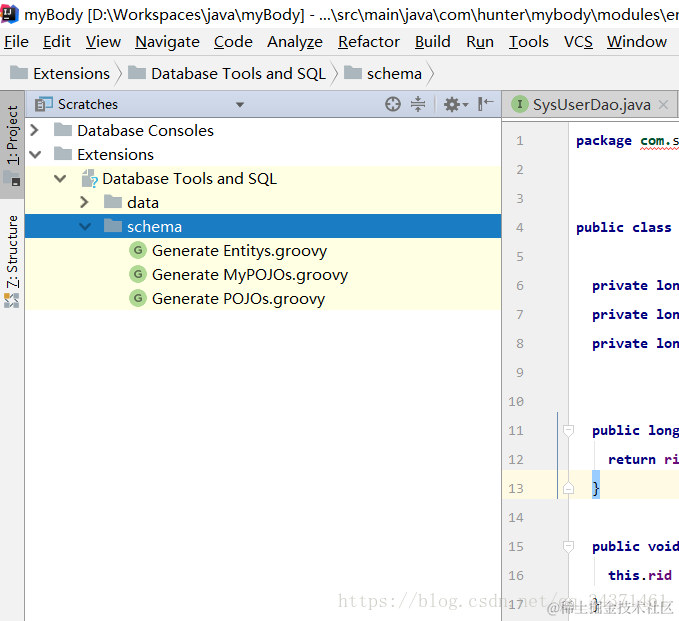 进来只有Generate POJOs.groovy,右键新建另外一个比如我的叫做:Generate MyPOJOs.groovy,里面内容如下: