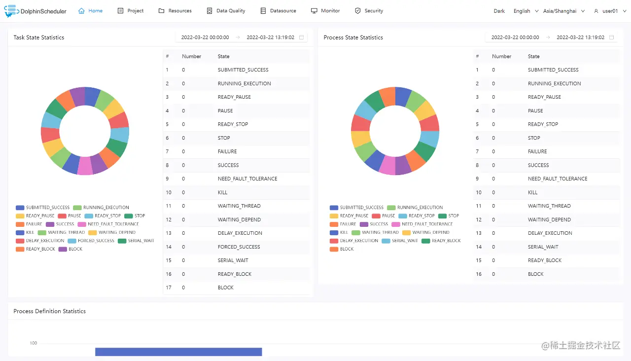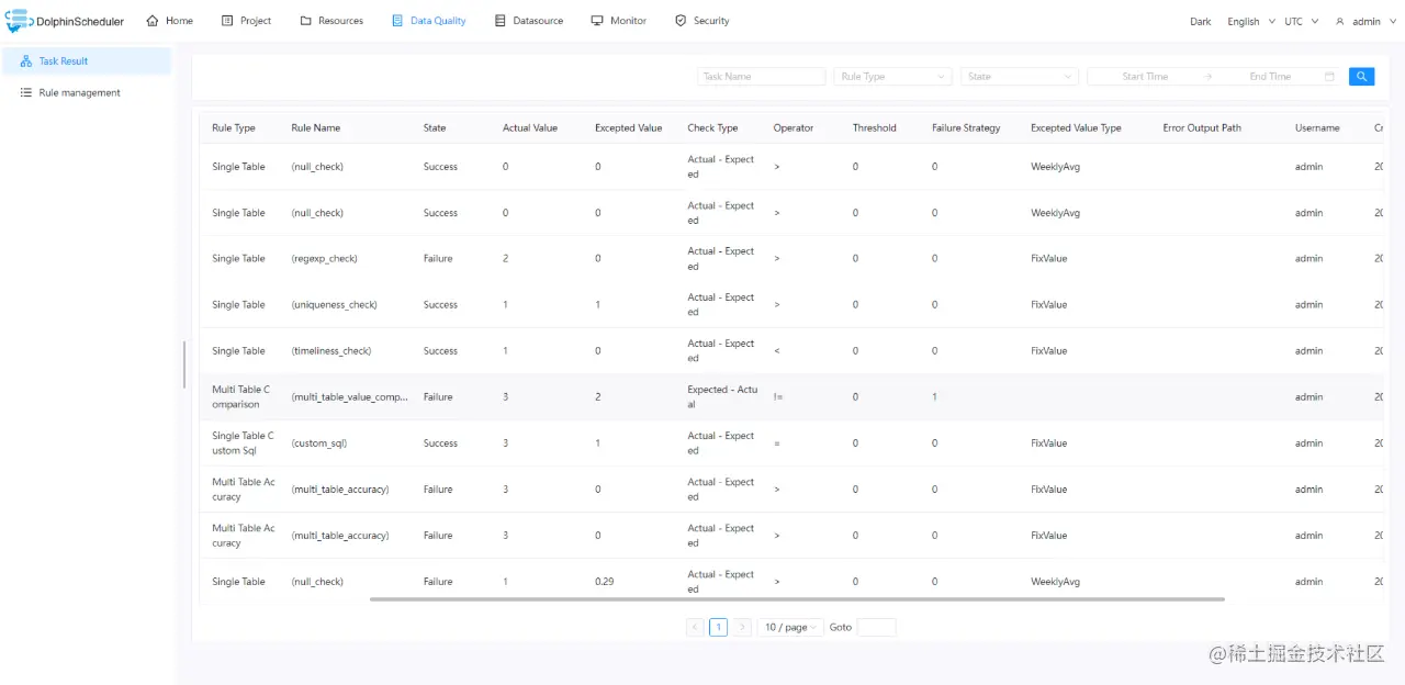 此版本中,用户期待已久的数据质量校验应用功能上线,解决了从源头同步的数据条数准确性,单表或多表周均、月均波动超过阈值告警等数据质量问题。Apache DolphinScheduler 此前版本解决了将任务以特定顺序和时间运行的问题,但数据运行完之后对数据的质量一直没有较为通用的衡量标准,用户需要付出额外的开发成本。