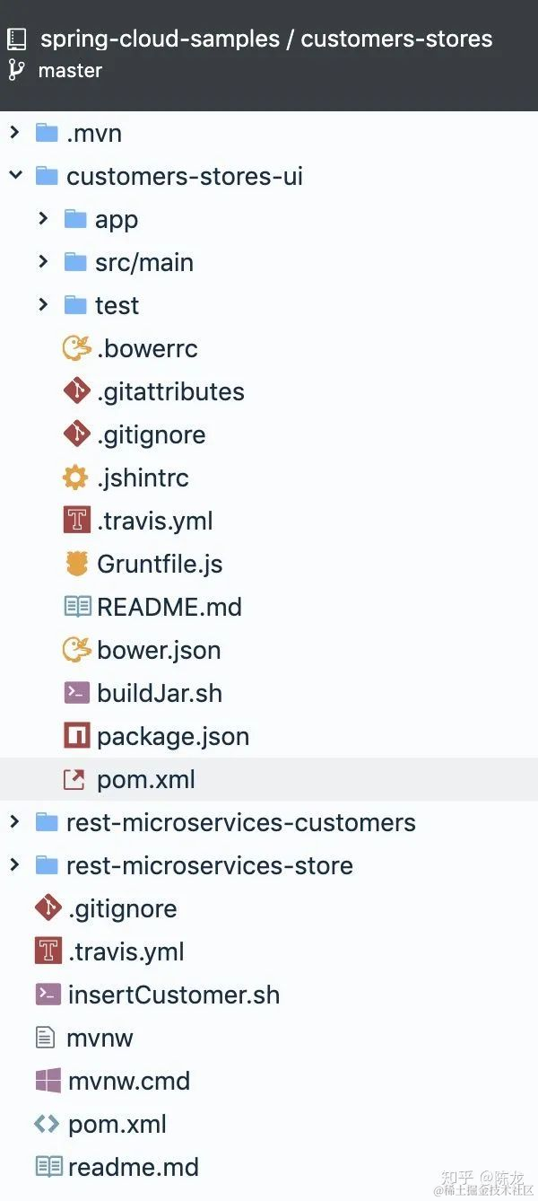 customers-stores-ui 是前端应用,用 Angularjs 实现的。例子是便于学习的,不应该引入额外的太多其他技术!为什么 Spring 官方的例子非要用上前端技术?不能只用服务器端开发人员熟悉的模板引擎(包括 JSP)来演示 Spring Cloud 吗?\