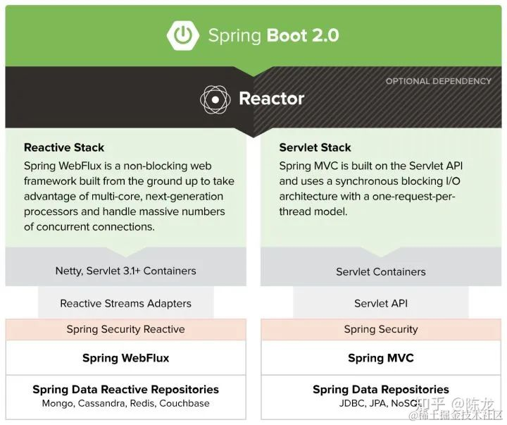 上图左侧是 Spring 5 新引入的 Spring WebFlux,右侧是大家熟悉的 Spring MVC,两者并列,Spring 同时支持。