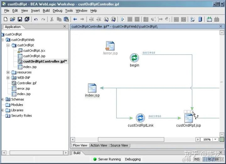Weblogic Server 中集成了 Struts,没记错的话当时是 1.1 版本。BEA 把 Struts 做了升级和改造,可以在 Weblogic Workshop 中可视化开发,就是下面这样: