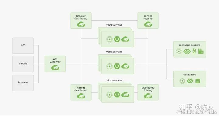 那怎么才算是使用 Spring Cloud 的正确姿势?还是看上面那幅图,这次关注左侧三个灰色的部分。IoT(物联网 Internet of Things)、Mobile(移动应用)、Browser(浏览器端),这三个也是应用啊。