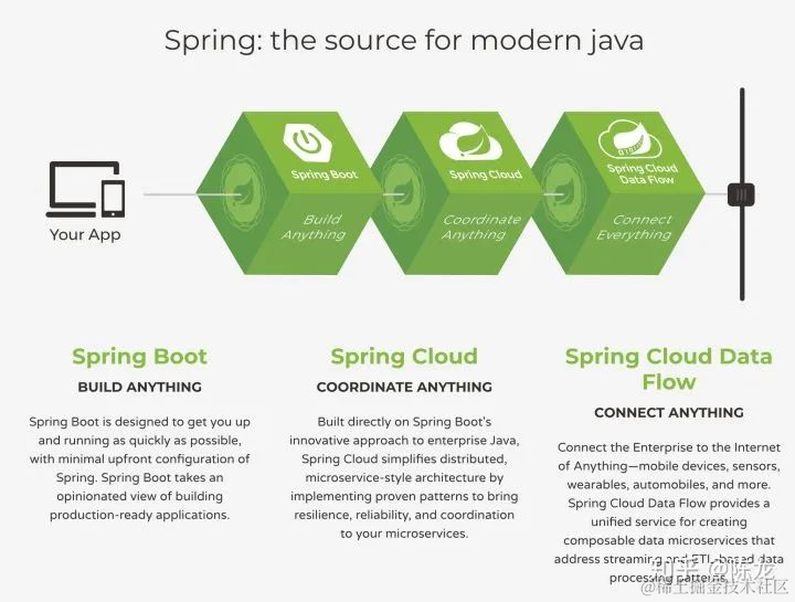 整个 Spring 体系的图出来了。还是看左侧,Your App,也就是 IoT(物联网 Internet of Things)、Mobile(移动应用)、Browser(浏览器端)这三类!\
