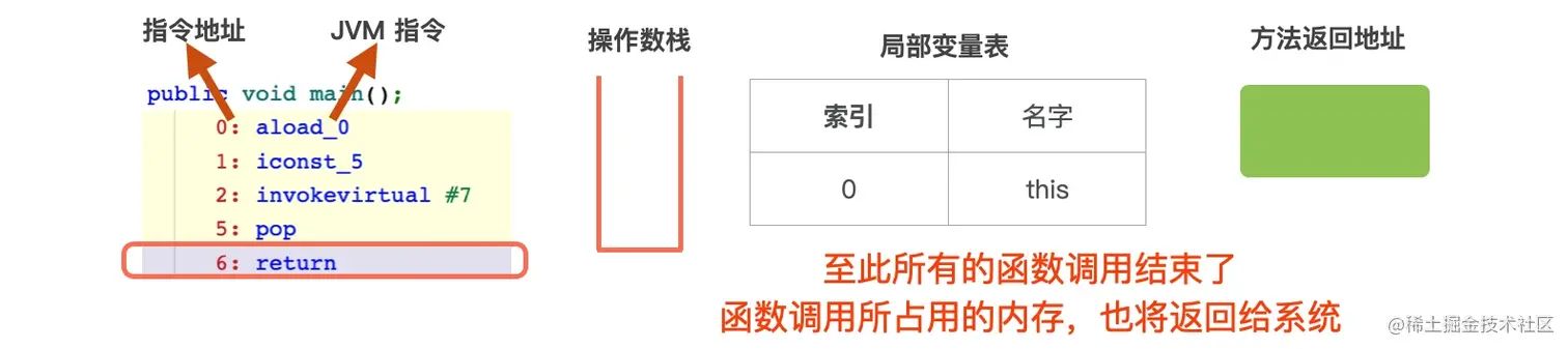 6: return,至此所有的方法调用结束了,方法所占用的内存,也将返回给系统