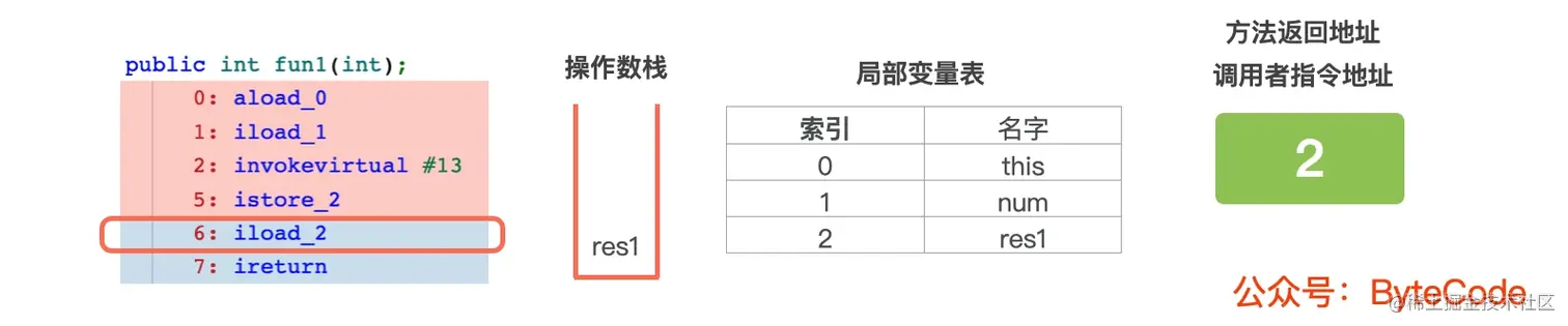 6: iload_2,从局部变量表中,读取索引为 2 变量res1的值,并压入操作数栈中