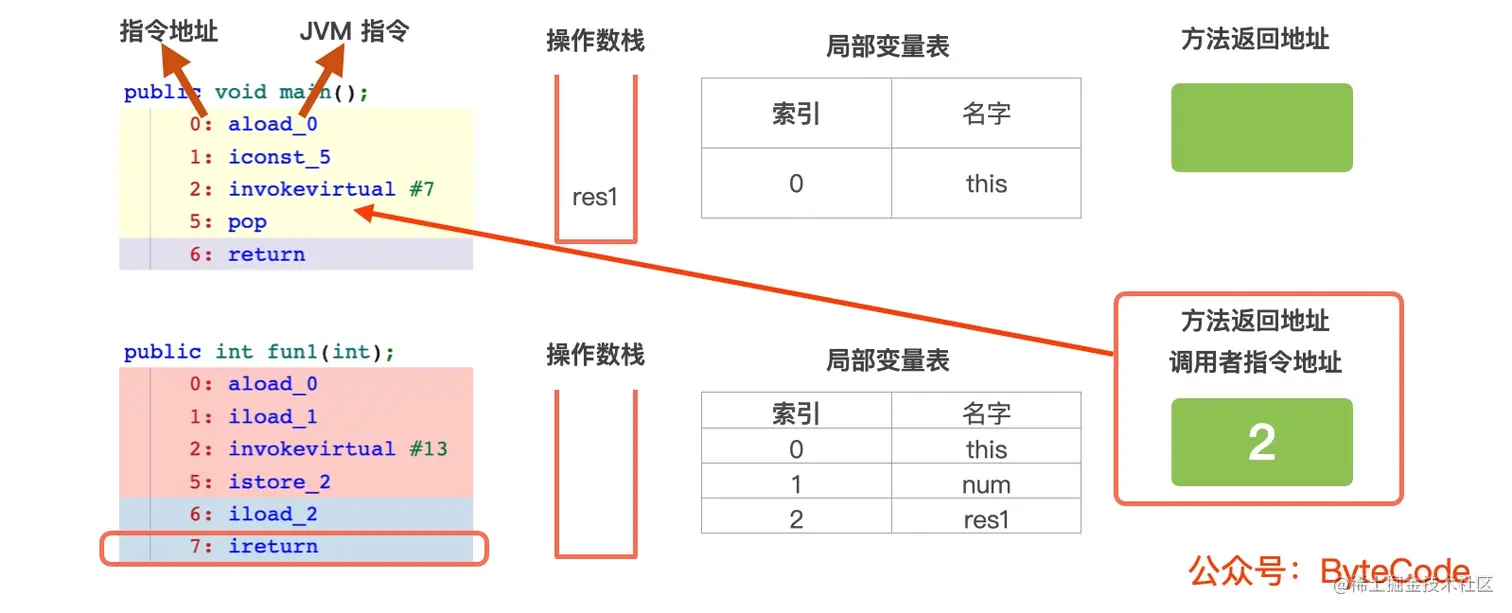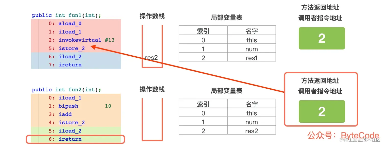 fun2结束时,执行最后一条指令ireturn,当前栈帧从虚拟机栈中出栈,根据当前栈帧保存的方法返回地址,返回到 fun1 ,恢复 fun1 的局部变量表、操作数栈,将返回结果res2保存到调用者(fun1)操作数栈中