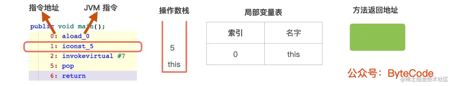 1: iconst_5,将常量 5 压入操作数栈中