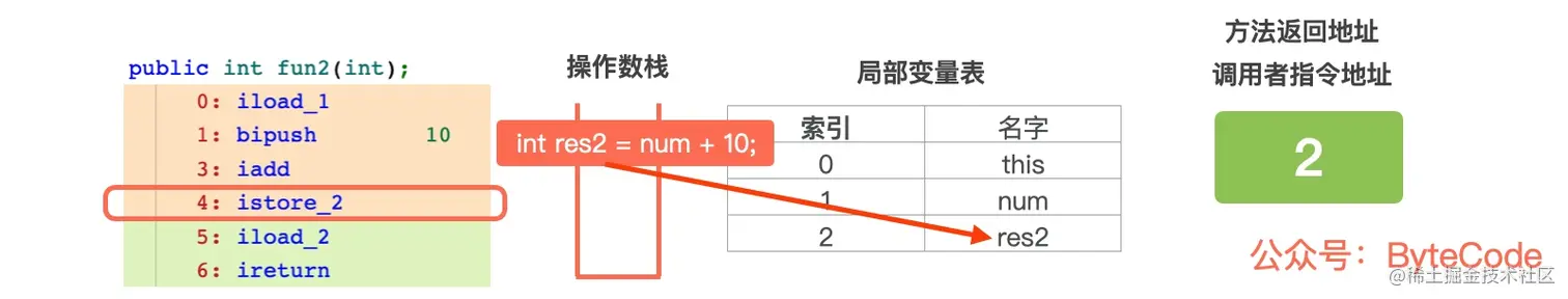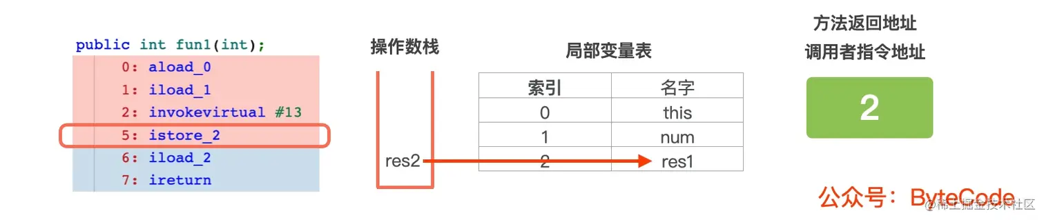 4: istore_2,从操作数栈中取出结果,并赋值给局部变量表中索引为 2 的变量 res2