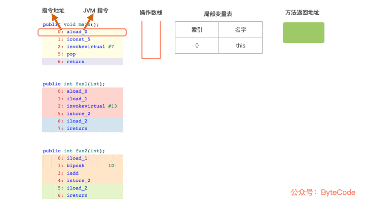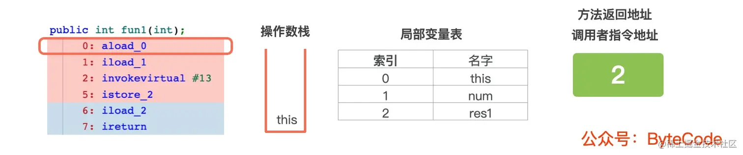 0: aload_0,从局部变量表中,读取索引为 0 的值,压入操作数栈中,因为是实例方法,所以索引为 0 的值是 this 的引用