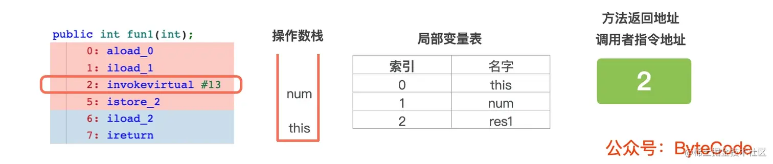 2: invokevirtual #13,num 和 this 从操作数栈中出栈,然后调用this.fun2(num)