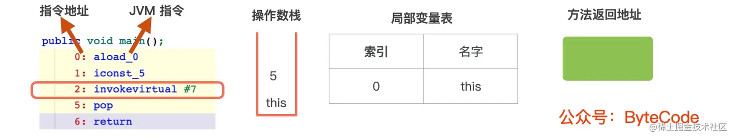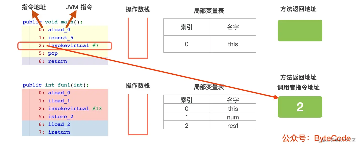 2: invokevirtual #7,常量 5 和 this 从操作数栈中出栈,然后调用this.fun1(5)