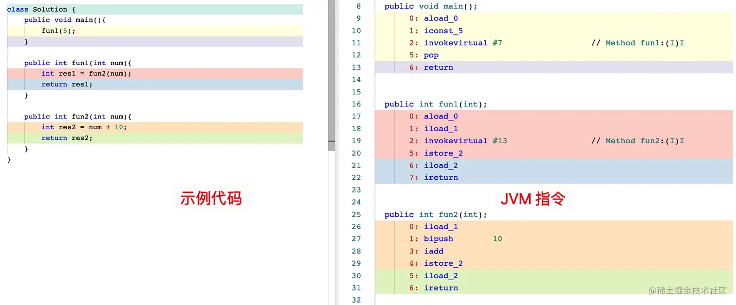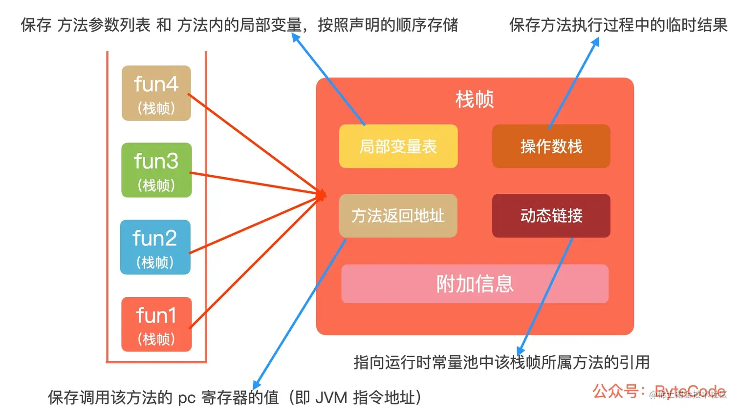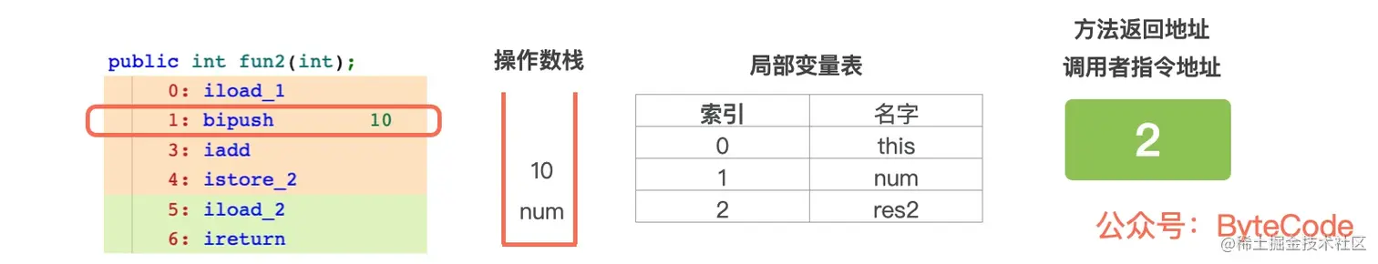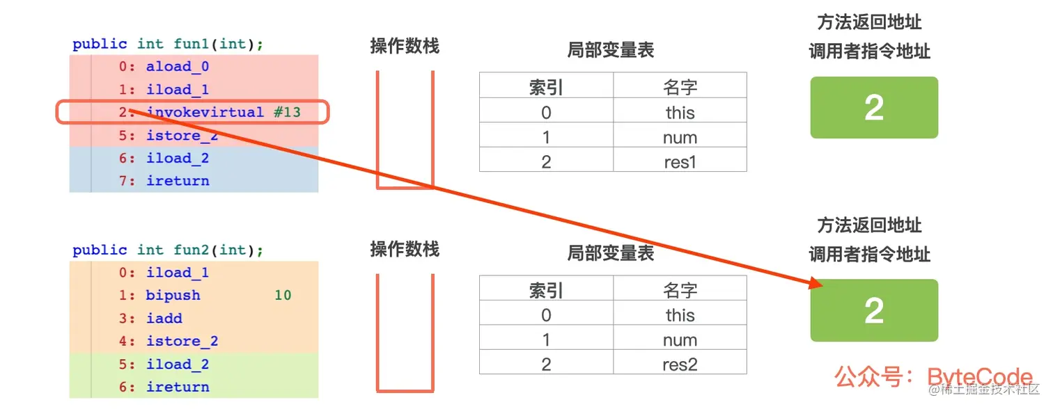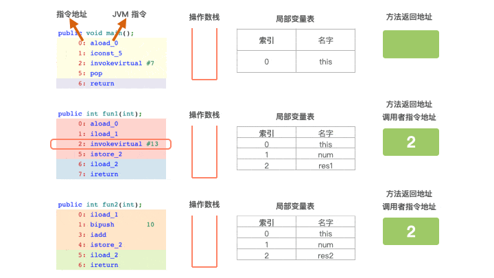 首先从常量池中找到方法 fun2() 的符号引用,然后通过动态链接将符号引用转换成直接引用,之后调用 this.fun2(num),将方法 fun2() 作为栈帧压入虚拟机栈中,跳转到 fun2(),继续往下执行,调用 fun2() 之前,fun2() 的局部变量表和方法返回地址已经确定好了。