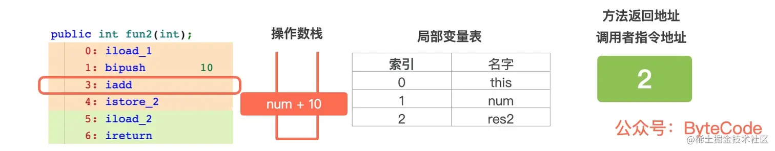 3: iadd,num 和常量 10 从操作数栈中出栈,然后进行相加,将结果压入操作数栈中