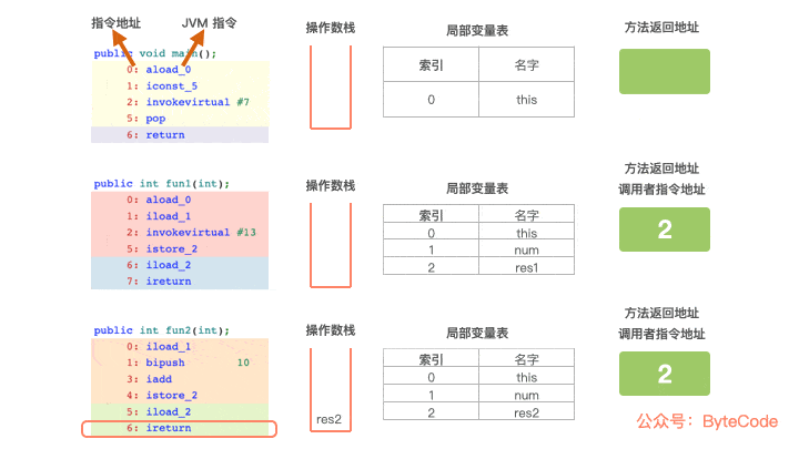 7: ireturn,当前栈帧从虚拟机栈中出栈,根据当前栈帧保存的方法返回地址,返回到 main 方法,恢复 main 方法的局部变量表、操作数栈,将返回结果res2保存到调用者(main)操作数栈中