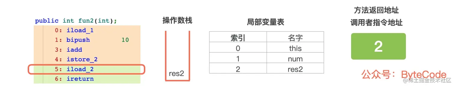 5: iload_2,从局部变量表中,读取索引为 2 的变量 res2 的值,并压入操作数栈中