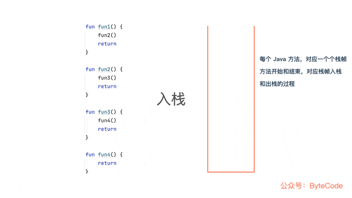每个 Java 方法,对应一个个栈帧,所以方法开始和结束,都是一个个栈帧入栈和出栈的过程,效果如下图所示。