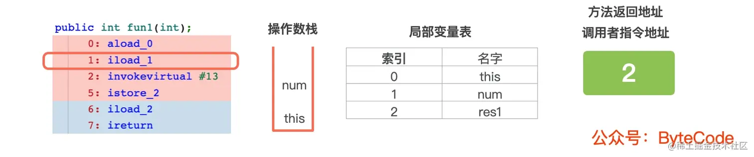 1: iload_1,从局部变量表中,读取索引为 1 变量 num 的值,并压入操作数栈