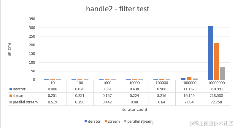 - 在少低数据量的处理场景中(size<=1000),stream 的处理效率是不如传统的 iterator 外部迭代器处理速度快的,但是实际上这些处理任务本身运行时间都低于毫秒,这点效率的差距对普通业务几乎没有影响,反而 stream 可以使得代码更加简洁;