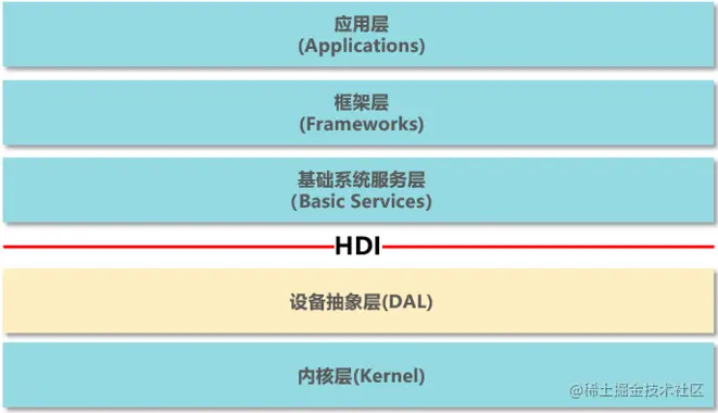 HDI(Hardware Device Interface,硬件设备接口)是 HDF 驱动框架为开发者提供的硬件规范化描述性接口。在 OpenHarmony 分层结构中,HDI 位于 “基础系统服务层”和“设备抽象层(DAL)”之间。硬件设备通过 DAL 抽象化,并基于 IDL(Interface Description Language)接口描述语言描述后,为上层应用或服务提供了规范的硬件设备接口。