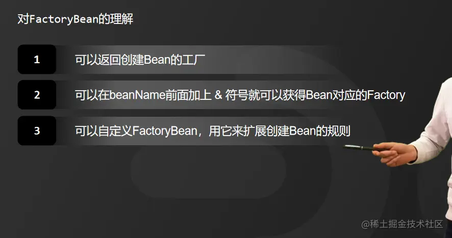 FactoryBean在使用上也有些特殊。在前面介绍的BeanFactory中,有一个常量叫做FACTORY_BEAN_PREFIX = “&”,当我们想要从Spring容器中获取创建Bean的Factory时,可以在beanName前面加上 & 符号就可以获得Bean对应的Factory。
