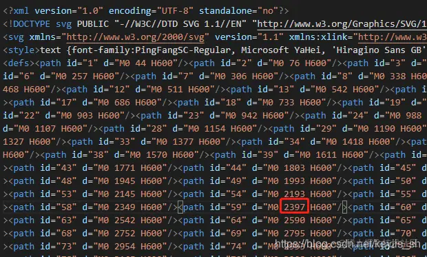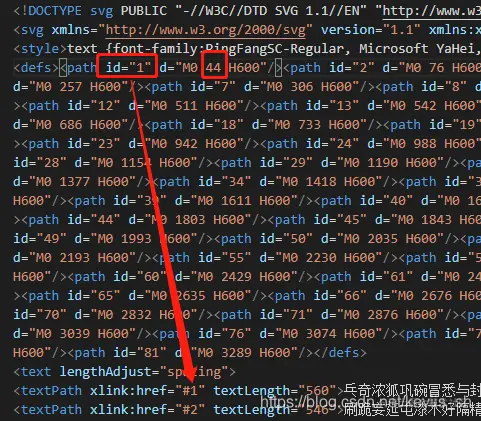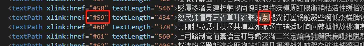 那么思路出来了,根据标签的class对应的background属性经过计算获得svg文件path标签d属性的第二个值,然后根据id=59找到对应的文字应该在xlink:href="#59"的textPath标签内,但是如何确定在这行的第几个呢?