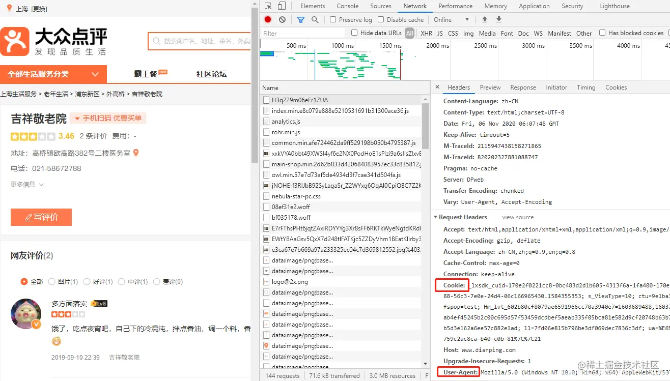 1、在请求的header里加上cookie/user-agent/accept,如果cookie过期,点评不会提示的,但是返回的数据(比如店铺的电话)里会用*代替有效内容,因此运行一段时间要主动去换下cookie。