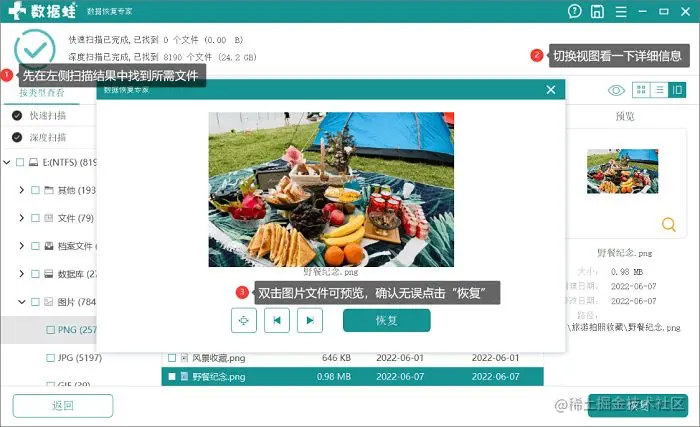 第3步:在扫描出来的结果里面找到自己丢失的文件,还可以切换视图看文件的详细信息,最后选择好之后即可“恢复”自己丢失的文件!