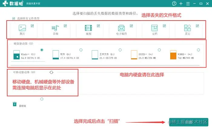 第2步:在首页界面以实际情况为准,选择丢失的文件以及它的存储位置后进行“扫描”;