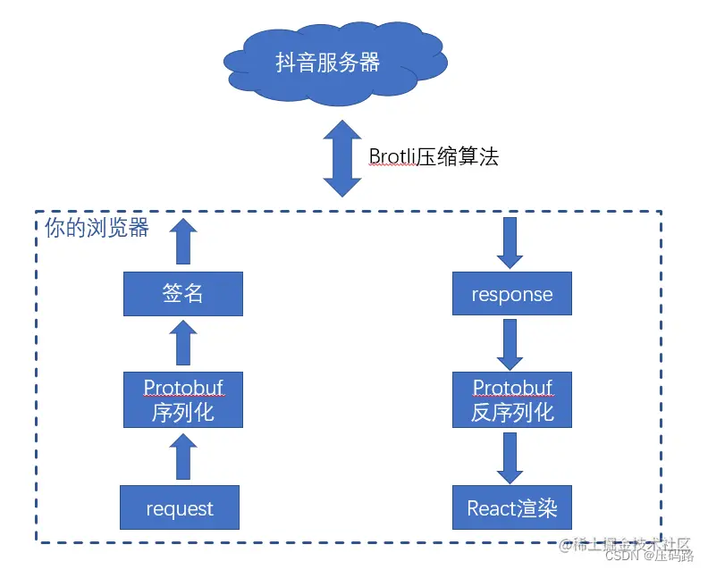 数据解析完成后使用react渲染,这个东西出自Facebook(脸书),最后就是抖音自己的签名加密了,都是js实现,花点时间也不是什么大问题。