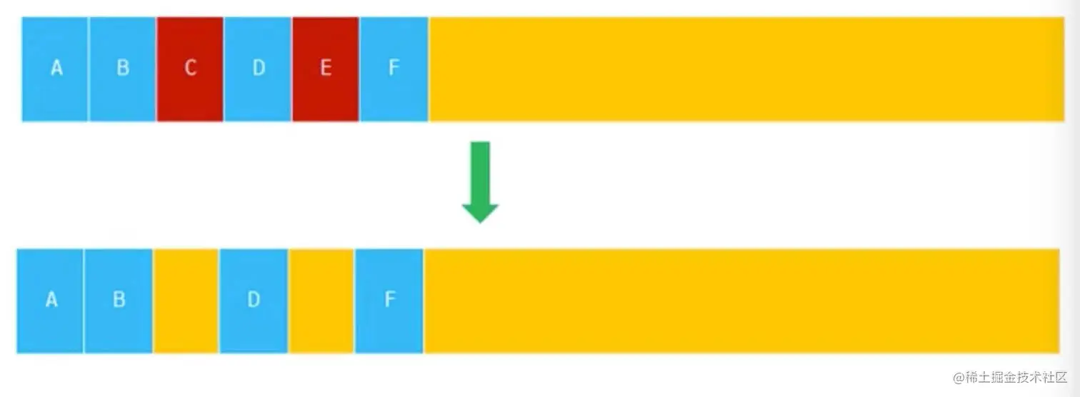 - 标记清除(Mark Sweep) Mark Sweep 是将需要被回收的对象进行标记,在垃圾回收运行时直接释放相应的地址空间,红色的区域就是需要被回收的