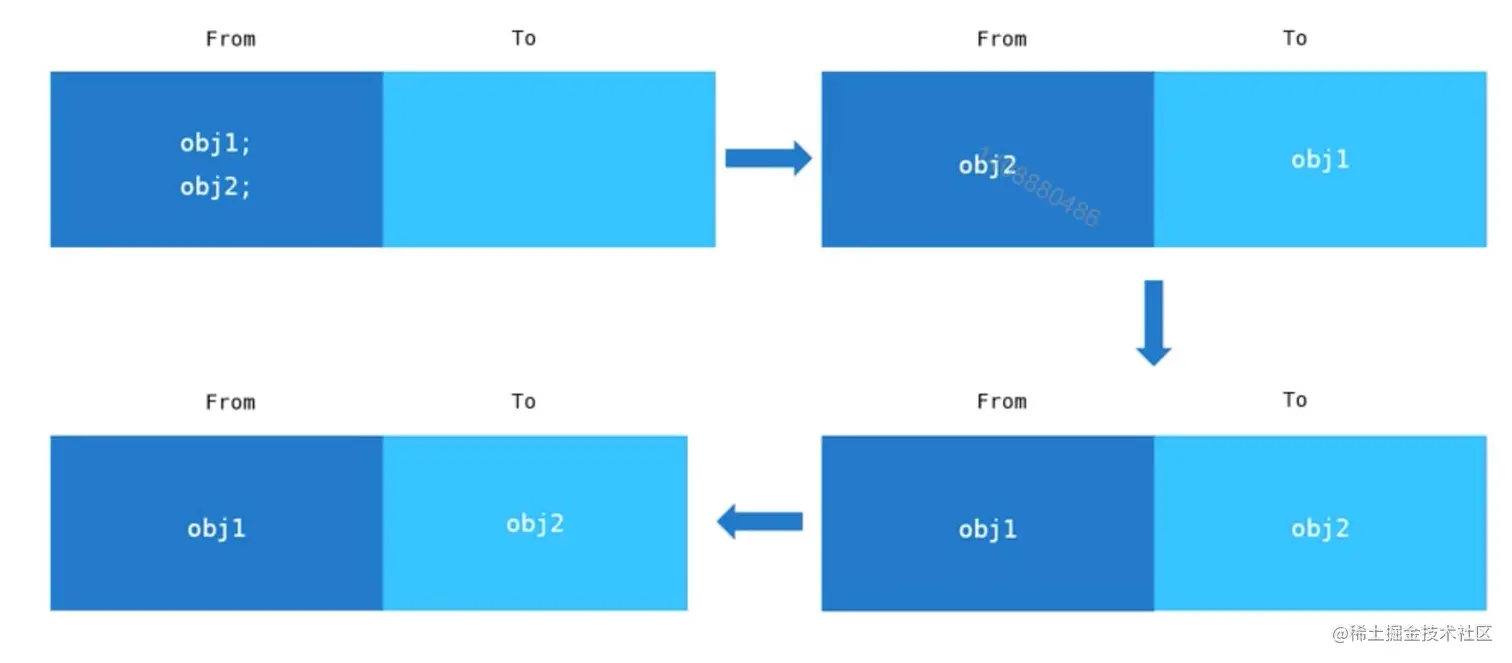 from 和 to 组成一个Semispace(半空间)当我们分配对象时,先在 from 对象中进行分配,当垃圾回收运行时先检查 from 中的对象,当obj2需要回收时将其留在 from 空间,而ob1分配到 to 空间,然后进行反转,将 from 空间和 to 空间进行互换,进行垃圾 回收时,将 to 空间的内存进行释放,简而言之 from 空间存放不被释放的对象,to 空间存放被释放的对象,当垃圾回收时将 to 空间的对象全部进行回收