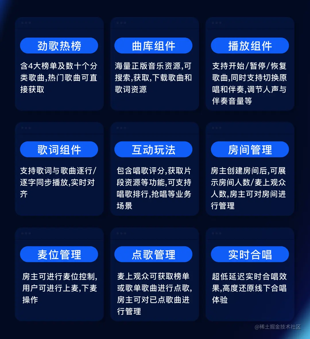 - 九大场景化组件: 企业可自由组合使用多项模块化场景能力,打造个性化在线 K 歌房;