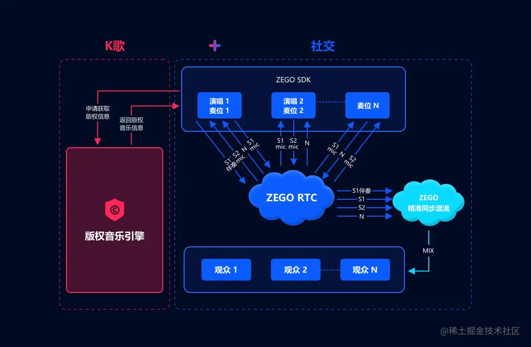 这些难题成为阻碍着社交、直播平台向用户提供线上 K 歌玩法的关键痛点,因此,为解决以上痛点,即构凭借多年在实时音视频技术的深耕,向企业和开发者提供了「社交 + K 歌」融合方案,助力泛娱乐企业更便捷的上线 K 歌玩法。