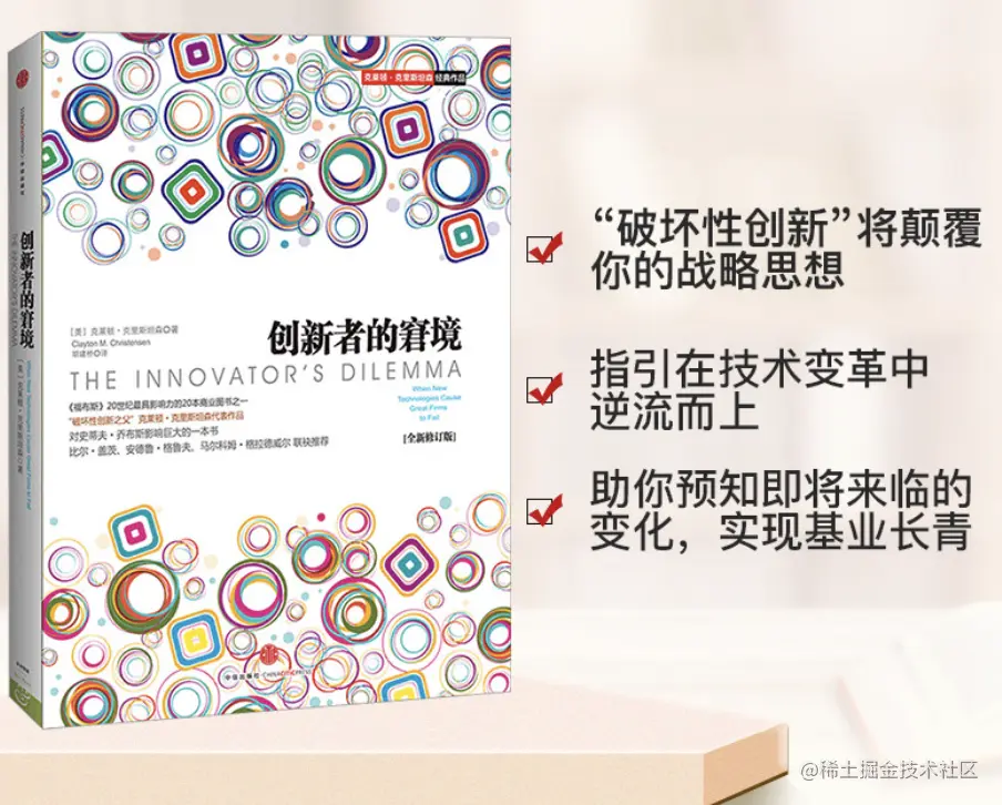 那原因到底是什么?答案就是“创新者的窘境”。有一本专门写为什么大公司被小公司超越、大产品被小产品超越的底层原因,书名就叫《创新者的窘境》。